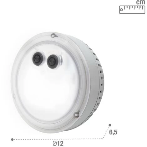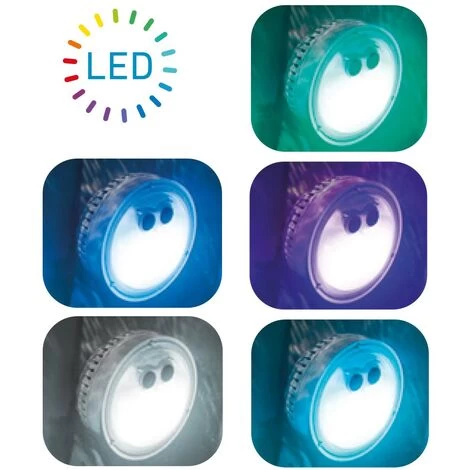 Luz LED para Spas de Burbujas INTEX. Lámpara eléctrica compatible exclusivamente con Spas de Burbujas INTEX (no es adecuado para spas de jets). Cuenta con 2 modos de iluminación: luz fija de 1 solo color o luz intermitente con 5 colores: blanco, verde, aguamarina, azul y lila. Función de apagado automático a las 2 horas. La luz LED para spa mide 12 cm de diámetro, funciona con 3 pilas AAA (no incluidas) y tiene 1 W de potencia.