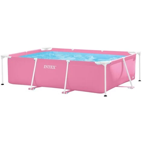 Piscina desmontable rectangular INTEX modelo Small Frame Familiar con medidas 220x150x60 cm y capacidad para 1.662 litros de agua. La lona de la piscina tiene un innovador color rosa que le aportará un toque divertido y original a tu jardín. Está fabricada de material SuperTough de 3 capas (PVC-Poliéster) para una mayor resistencia frente a perforaciones y una estructura tubular de acero metálico con juntas en T para facilitar el montaje con acabado epoxi antióxido interior y exterior. La piscina incorpora conexiones de Ø32 mm para poder adaptar una depuradora (no incluida), tapón de vaciado conectable a una manguera (no incluida) para desaguar en la zona más apropiada de tu jardín y manual de instrucciones. El tiempo de montaje aproximado de la piscina es de 30 minutos y se recomienda instalarla sobre una superficie lisa, estable y nivelada.