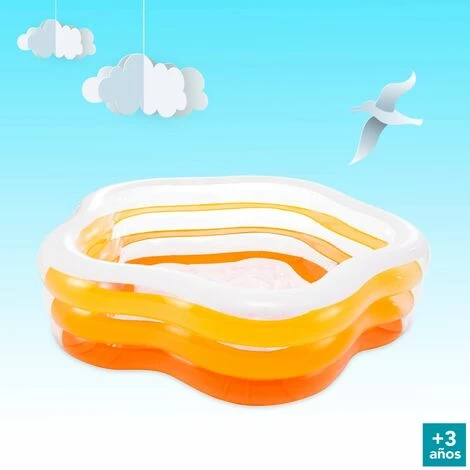 Piscina hinchable infantil con forma de estrella INTEX. Tiene capacidad para 460 litros de agua, mide 185x180x53 cm y cuenta con 3 cámaras de aire para una mayor estabilidad y resistencia diferenciadas por colores en tonos naranja. Cuenta con suelo acolchado para mayor comodidad e incorpora un tapón de desagüe para un drenaje más fácil y controlado. Incluye parche de reparación de pinchazos.