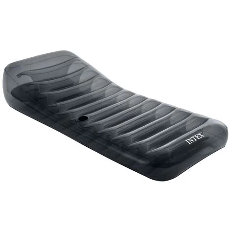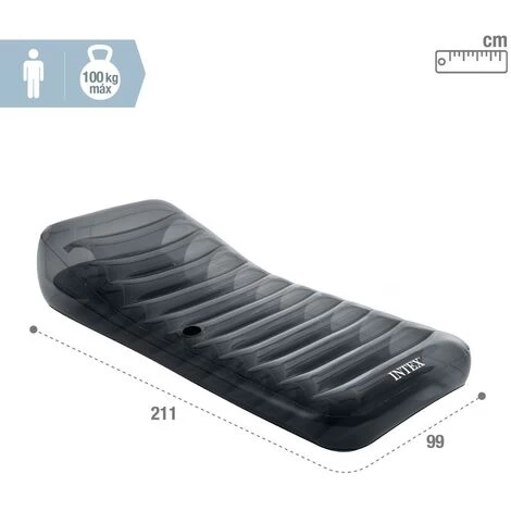 Tumbona hinchable INTEX color gris semitransparente con diseño y calidad Premium. Mide hinchada 211×99 cm y está fabricada en PVC, material vinílico altamente resistente con 0,33 mm de espesor. Cuenta con respaldo elevado que proporciona una posición semi tumbada, 1 porta bebidas y 2 cámaras de aire para mayor seguridad. Además, incluye un parche de reparación para arreglar posibles poros o arañazos. Tiene capacidad para una persona y soporta un peso máximo de 100 kg.
